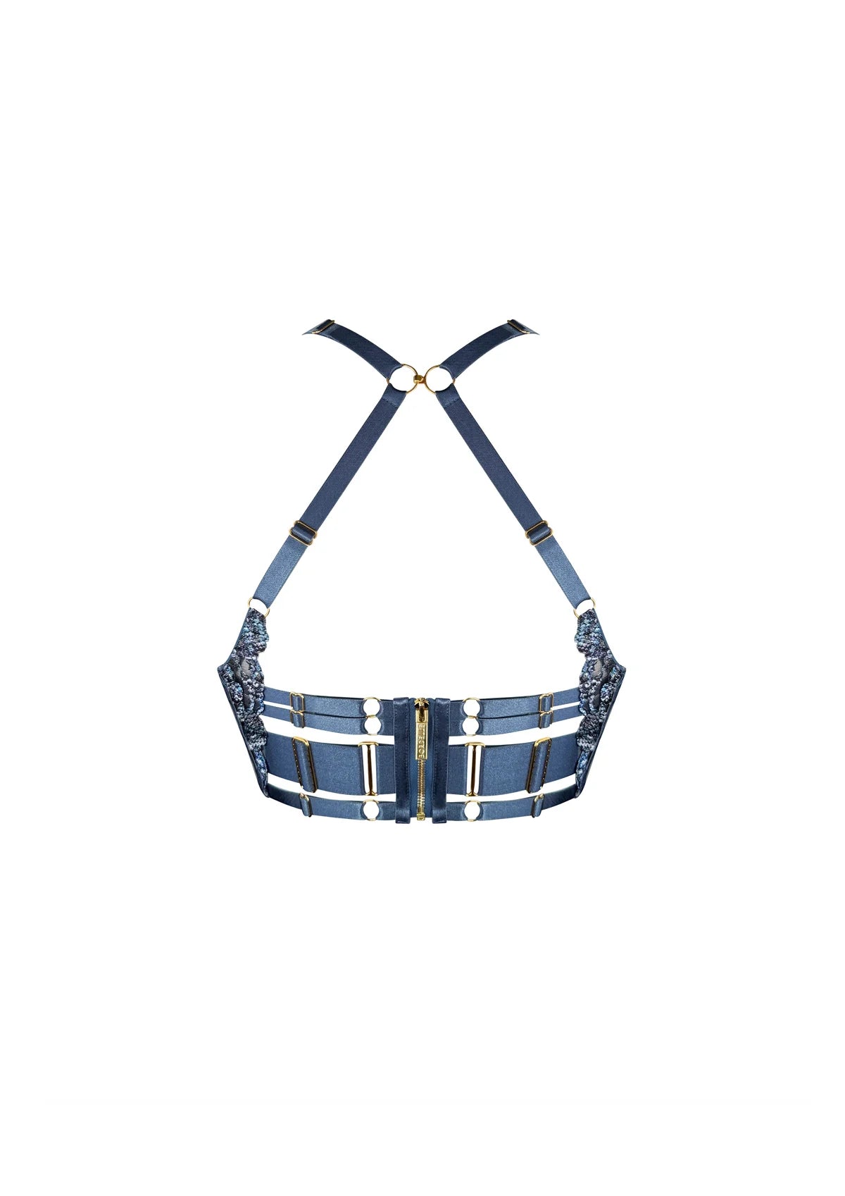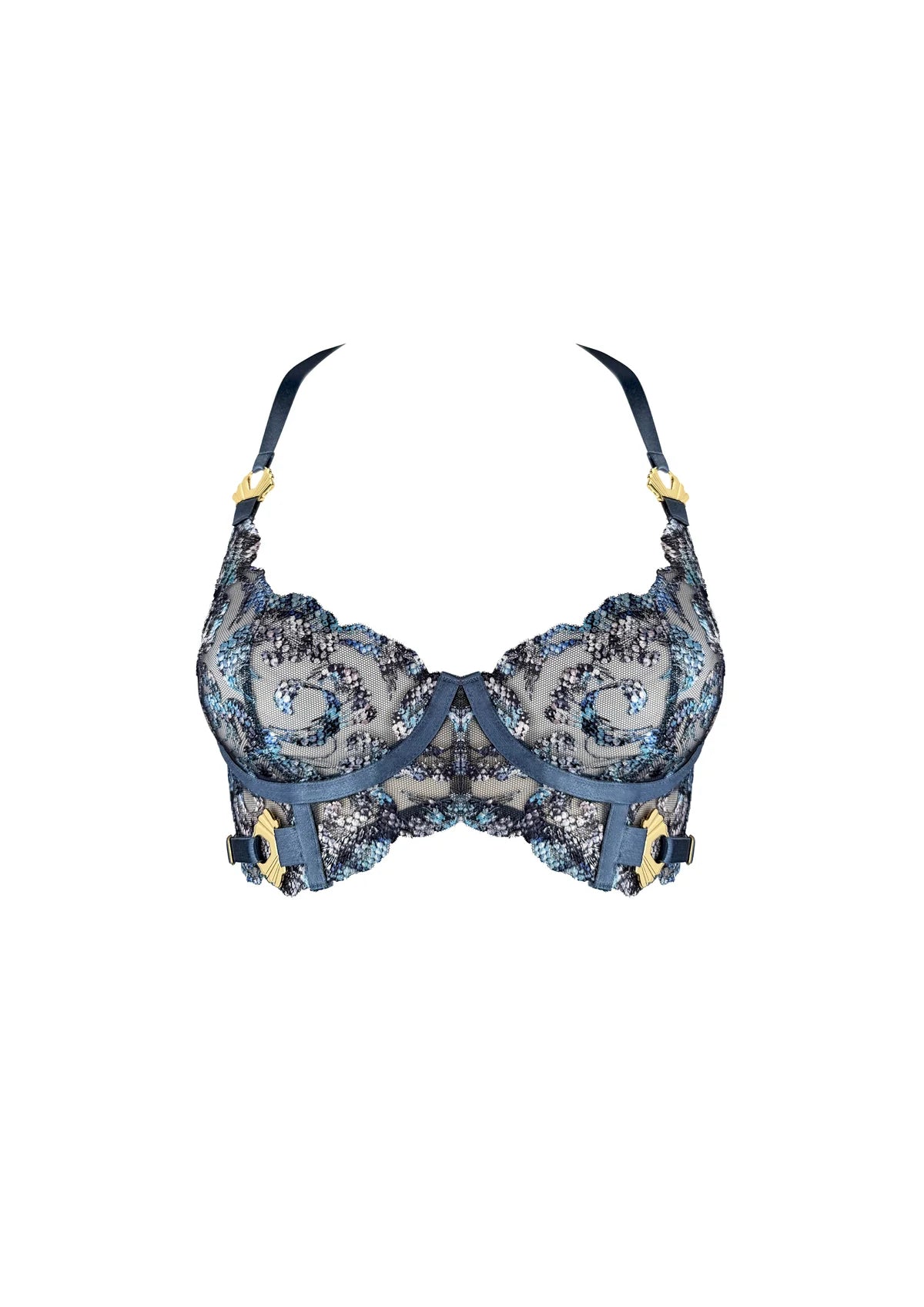 Four 24k gold-plated shell components adorn the front, while embroidered tulle panels flow seamlessly into satin elastic shoulder straps. The balconette shape offers gentle lift and structure, complemented by a 24k gold-plated zip fastening for an effortlessly sleek finish.