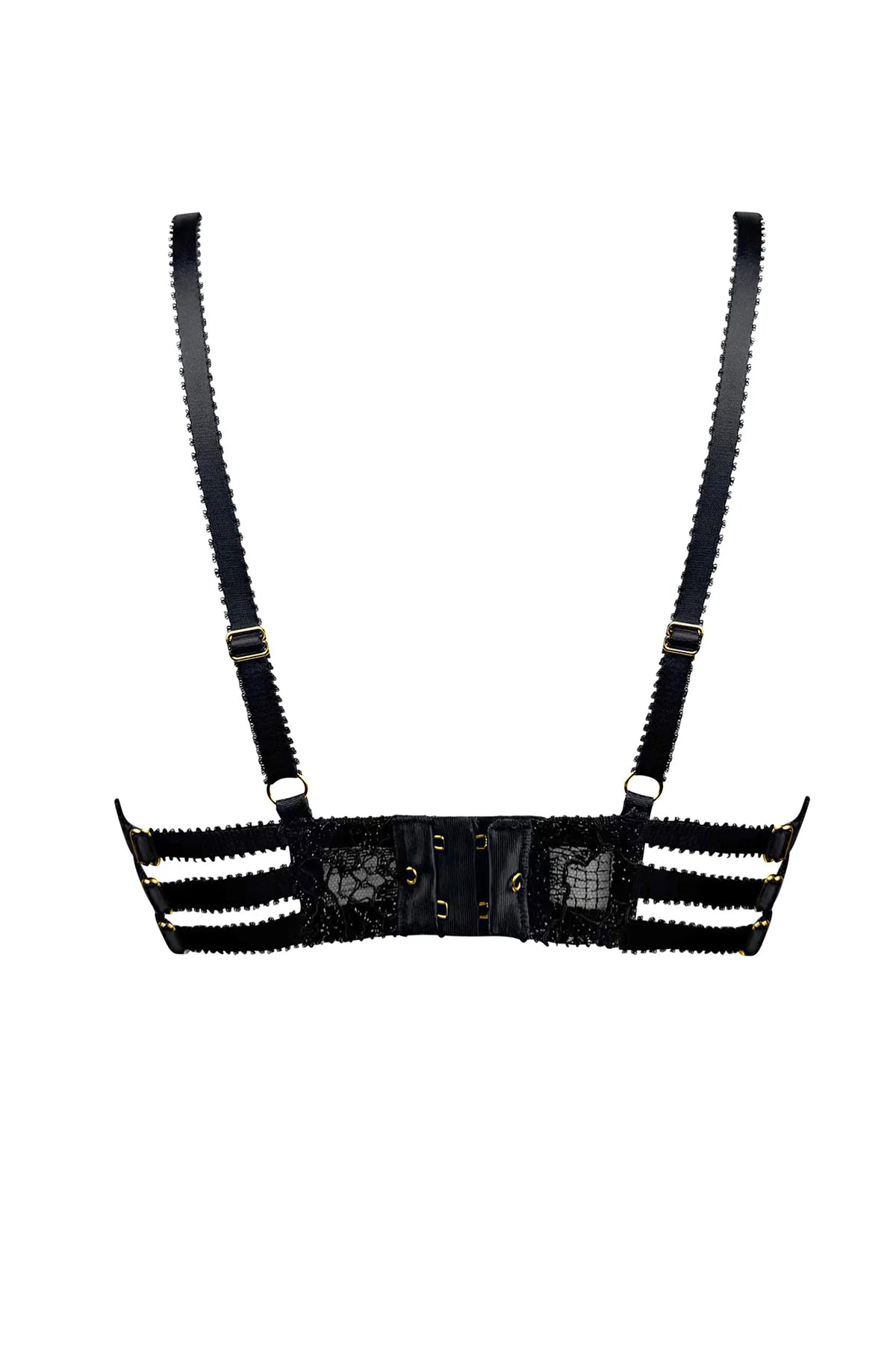 Edge o’ Beyond Lisha Bra is crafted in the UK from whisper soft tulle paired with metallic French Leavers lace. Semi sheer and unforgettable, this striking style is designed to lift and flatter the décolletage while the sultry strapping frames the chest with quiet confidence. A fully adjustable back allows for a personalised fit, ensuring the Lisha Bra feels as good as it looks. Contrasting noir straps and 24K gold plated hardware give this piece that unmistakable Edge o’ Beyond signature, refined yet daring, delicate yet powerful.