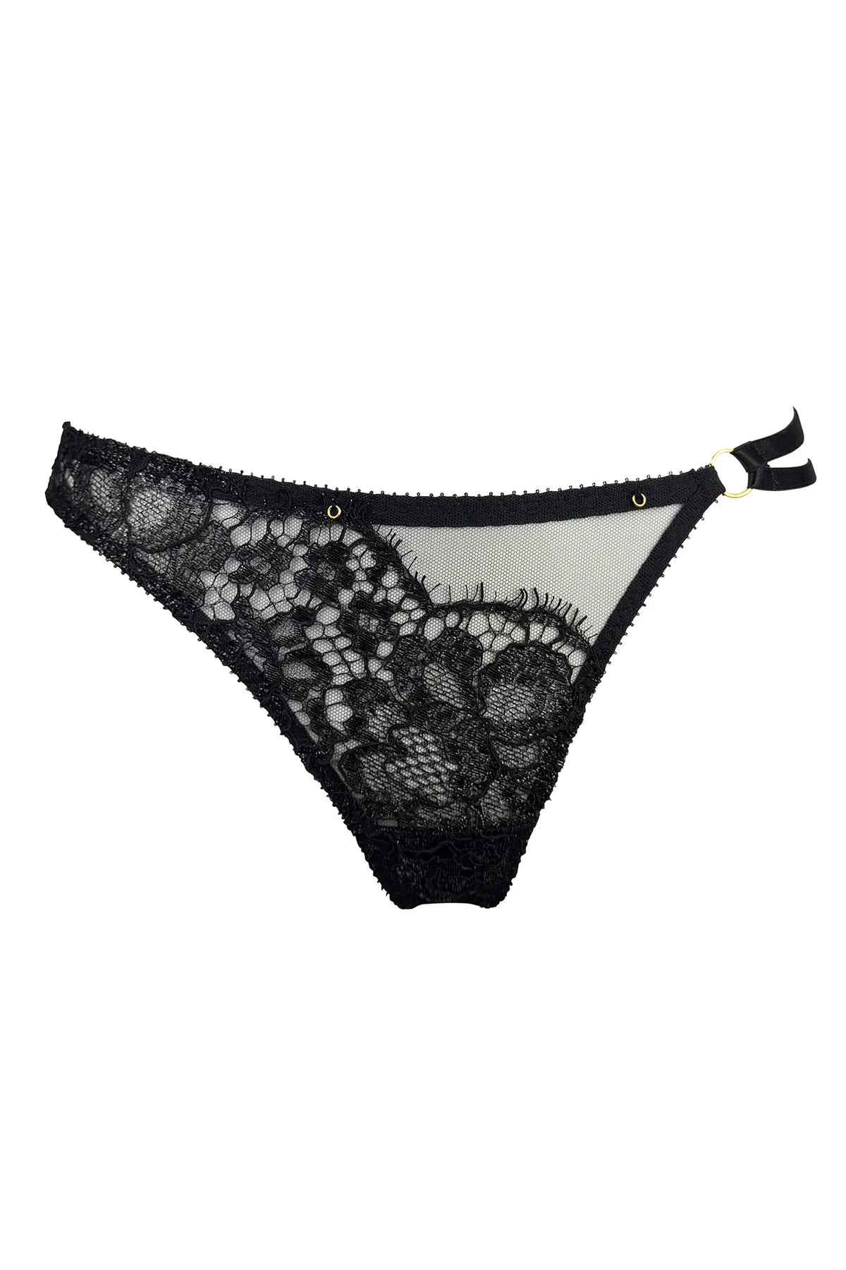 Edge o’ Beyond Lisha Brief is crafted in the UK from whisper soft tulle and metallic French Leavers lace. Semi sheer and effortlessly sensual, this refined style features asymmetric lace scalloping across both the front and back, creating a beautifully fluid, sculpted look. The classic brief cut offers an elegant balance of comfort and allure, while asymmetric side strapping and 24K gold plated hardware bring the unmistakable Edge o’ Beyond signature to life.