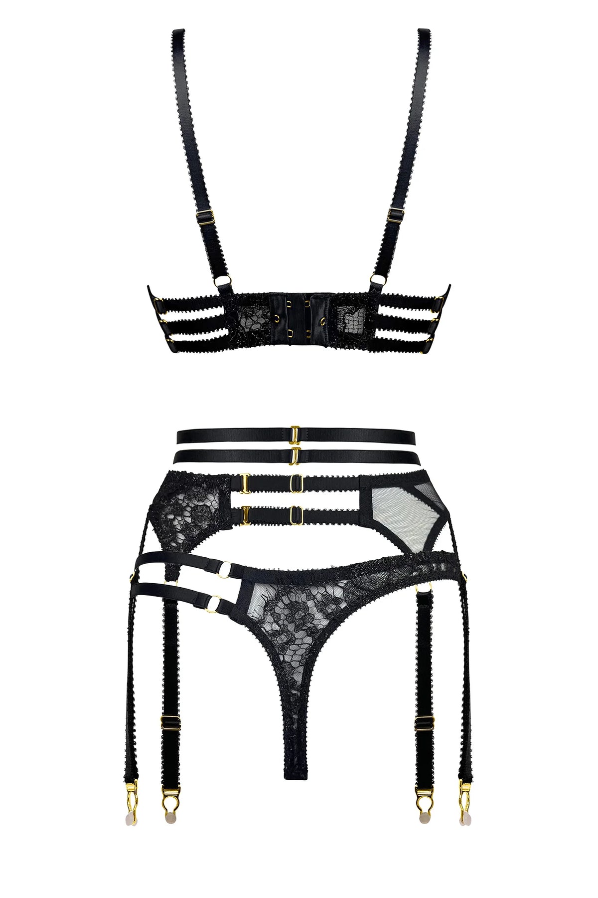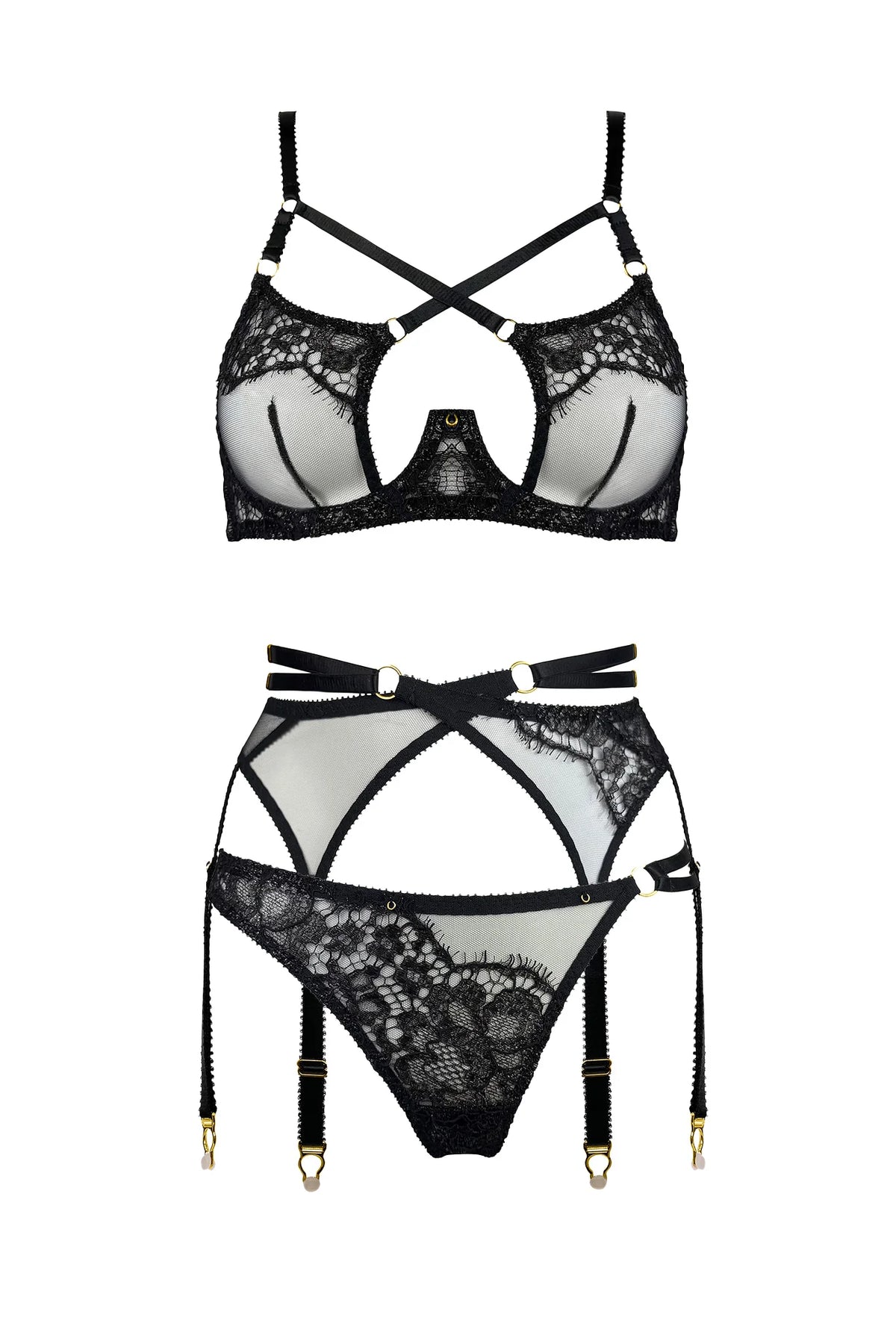 Edge o’ Beyond Lisha Suspender is crafted in the UK from whisper soft tulle and metallic French Leavers lace. Semi sheer and striking, this sculpting style wraps the body in elegance while the asymmetric lace scallop adds a refined, directional touch. Sultry strapping defines the torso with beautiful precision, creating a silhouette that feels both powerful and irresistibly feminine. Finished with 24K gold plated hardware, the Lisha Suspender carries the unmistakable Edge o’ Beyond signature of modern luxury.