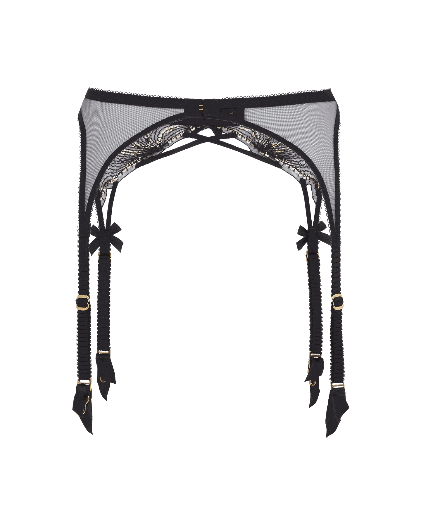 De zwarte jarretel heeft een basis van doorschijnende tule, versierd met Franse borduursels, wervelingen van gouden pailletten en afgewerkt met elastische rouleau-details.
