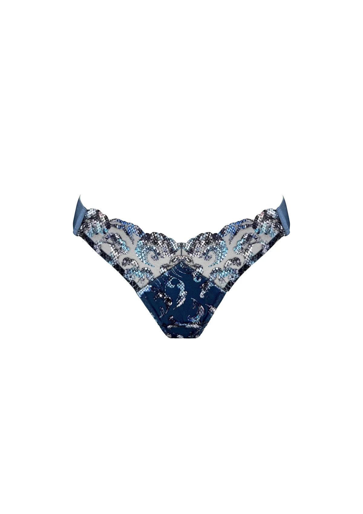 The Bordelle Siren Thong in Denim is a refined expression of modern sensuality and craftsmanship. Crafted from bespoke embroidered tulle using an innovative printing technique that creates a subtle scale-effect texture and pearlescent sheen, this piece captures the shimmer and depth of ocean waves — the essence of the Siren story.